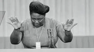 Fannie Lou Hamer quiets the crowd at the Democratic National Convention in Chicago, Illinois in 1968.