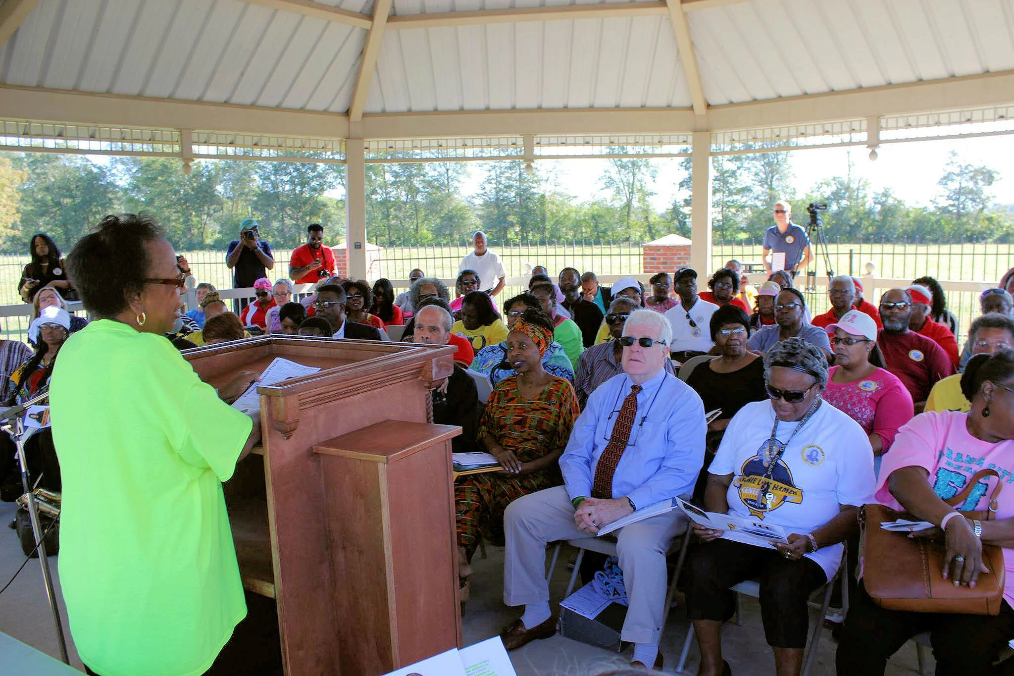 Hattie Jordan, a friend of Hamer's, speaks to a packed pavilion during the Centennial celebration.