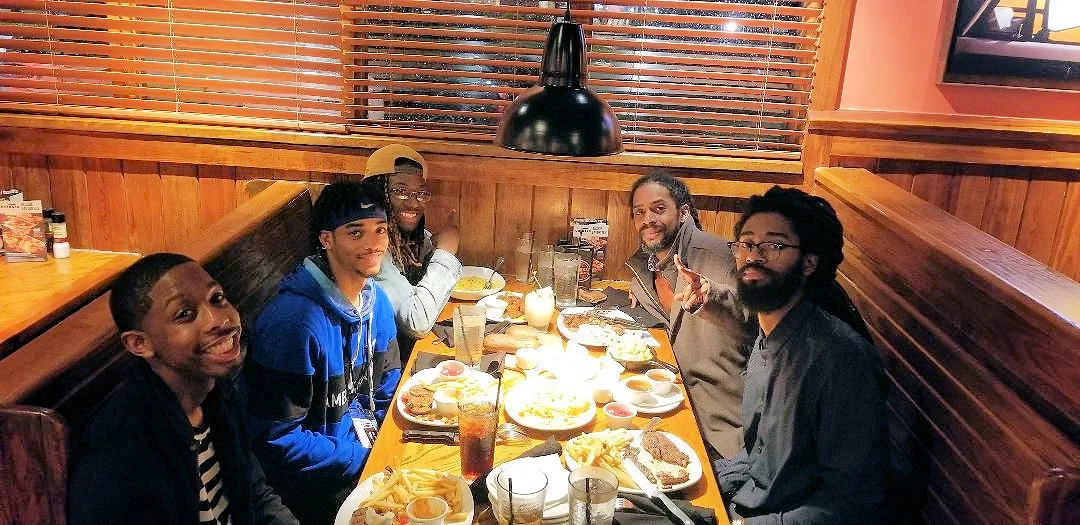 Students (l) Keziah Allen, Keyshaun Meeks and Keyshawn Brison grab a bite with filmmakers and SCFA Instructors (r) R.J. Fitzpatrick and Pablo Correa after the screening of Find Your Voice at the Crossroads Film Festival.