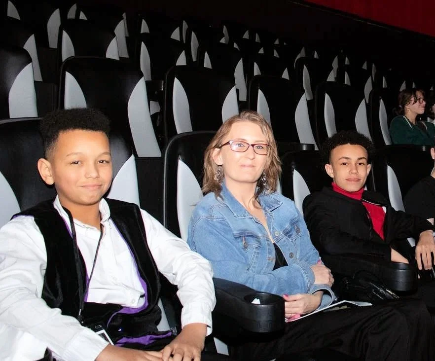 Keyshawn Brison, Keyshaun Meeks and Keziah Allen enjoy seeing their film, Find Your Voice, on the big screen at the Malco Theater in Madison where it premiered at the 2019 Crossroads Film Festival. Filmmaker and SCFA Instructor Pablo Correa (l) is also pictured.