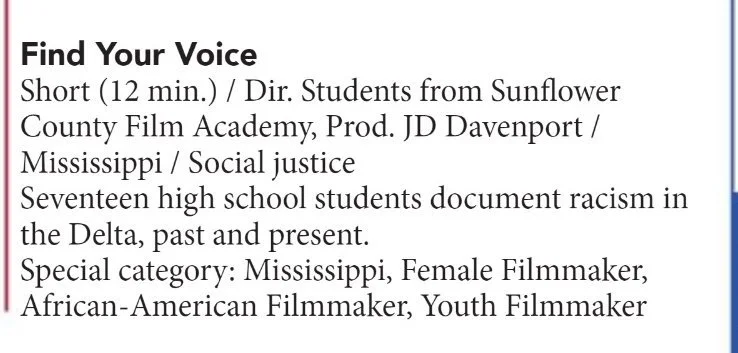 The 20th Annual Crossroads Film Festival was held April 11-13, 2019 in Madison, MS at the Malco Grandview Cinema. The festival that year featured several tales of freedom and the Civil Rights Movement, including, Find Your Voice, produced by the students of the 2018 Sunflower County Film Academy (SCFA).