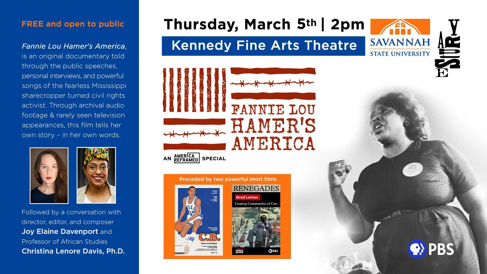 Directed and edited by Joy Elaine Davenport, Fannie Lou Hamer’s America is a portrait of the late Mississippi-sharecropper-turned-human-rights-activist. Through archival video and audio footage, the film allows Hamer to tell her own story - in her own words - and explores and celebrates the lesser-known life of one of the Civil Rights Movement’s greatest leaders.
