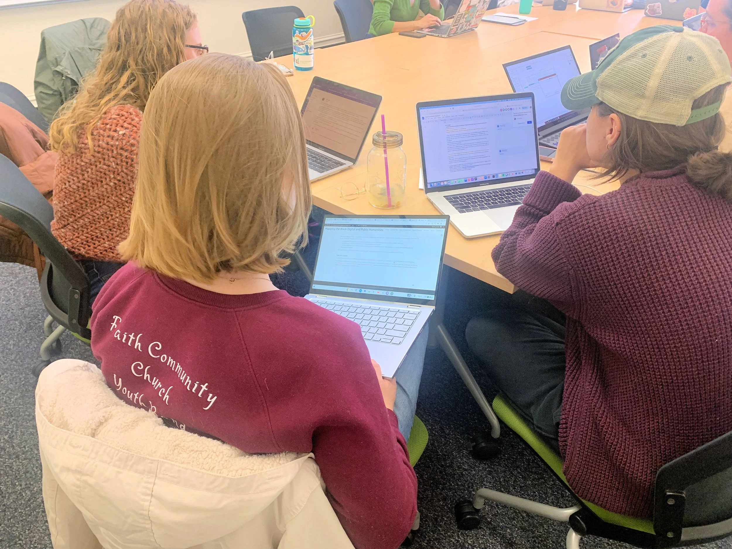 JMU graduate students Bailey McInturff, Ava Jacobs, and Emma Gentry work on finalizing the text for the Mapping project’s homepage in April 2023.