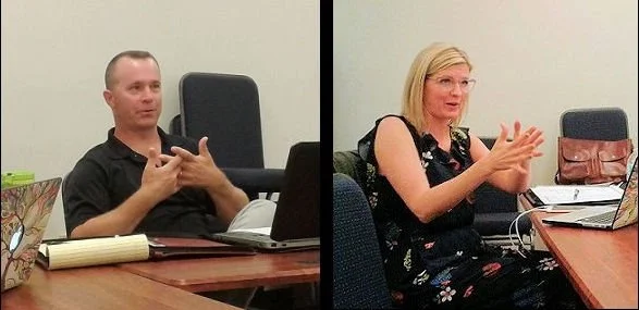 Researchers Davis Houck and Maegan Parker Brooks at a production meeting for the film in 2018.