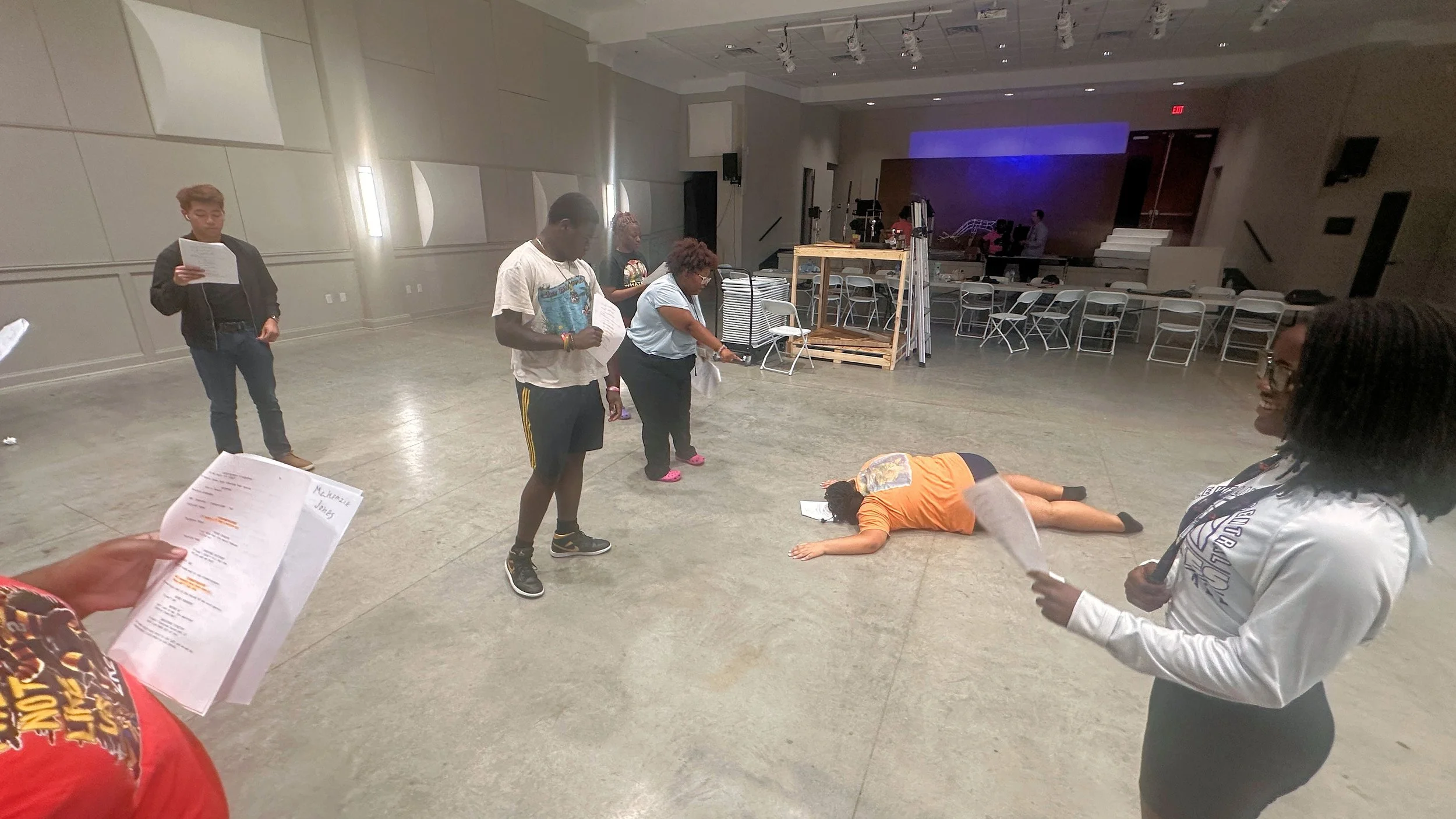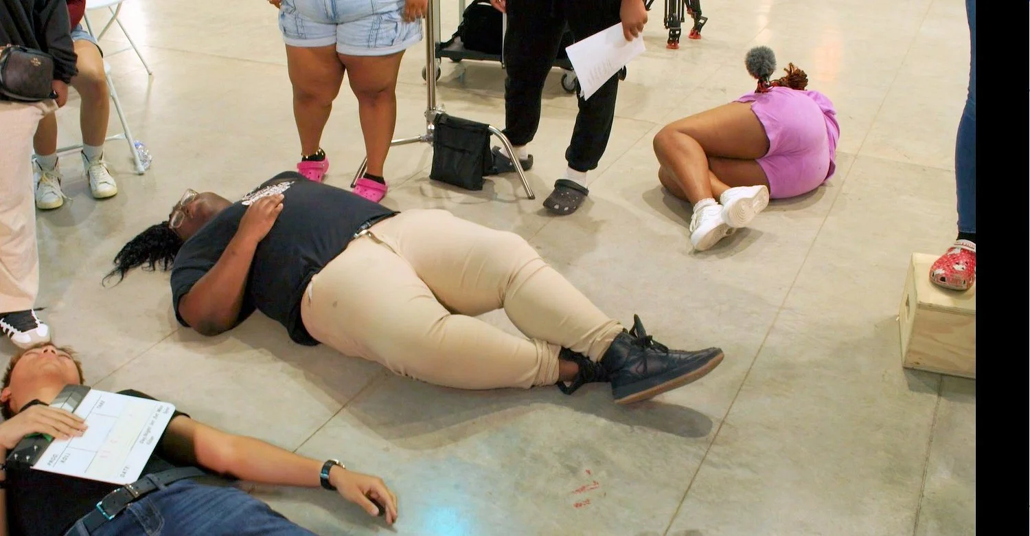 SCFA Students and actors Darren Chau, Makenzie Jones and JaMyra Walker lay "dead" on the movie set
